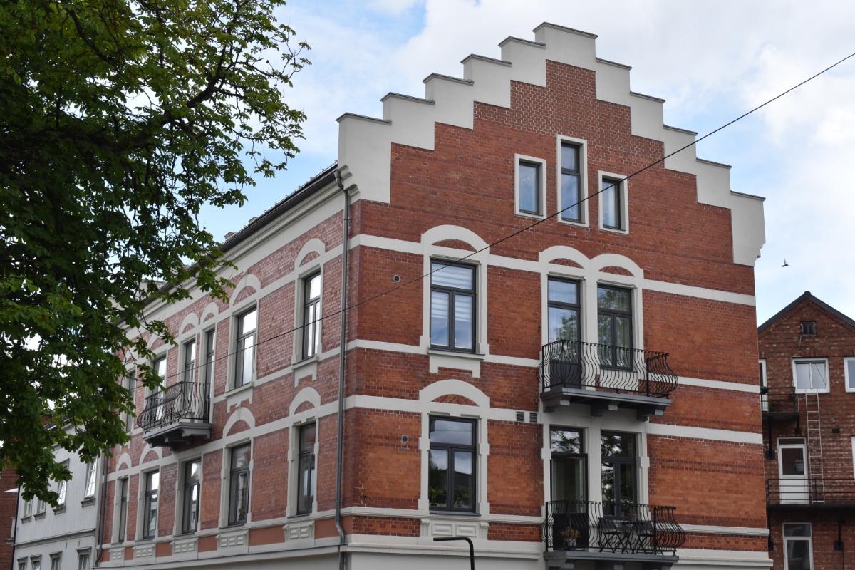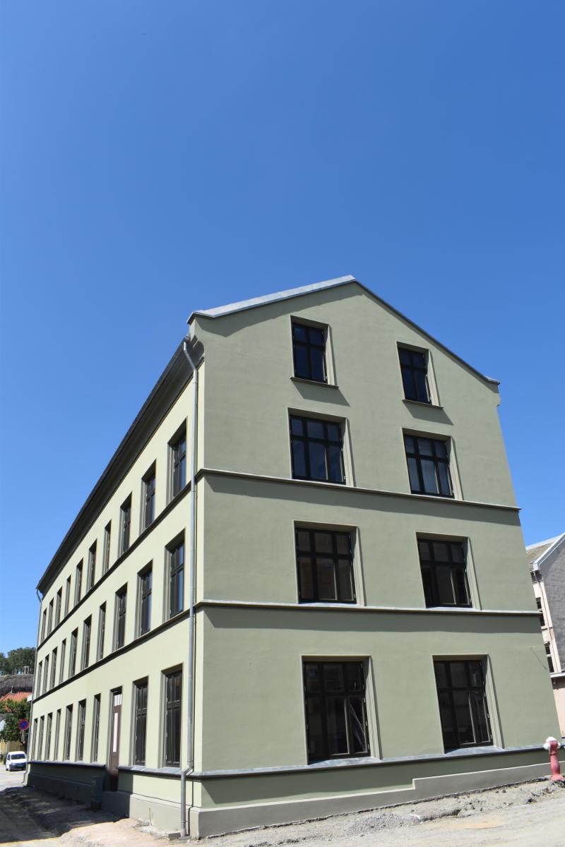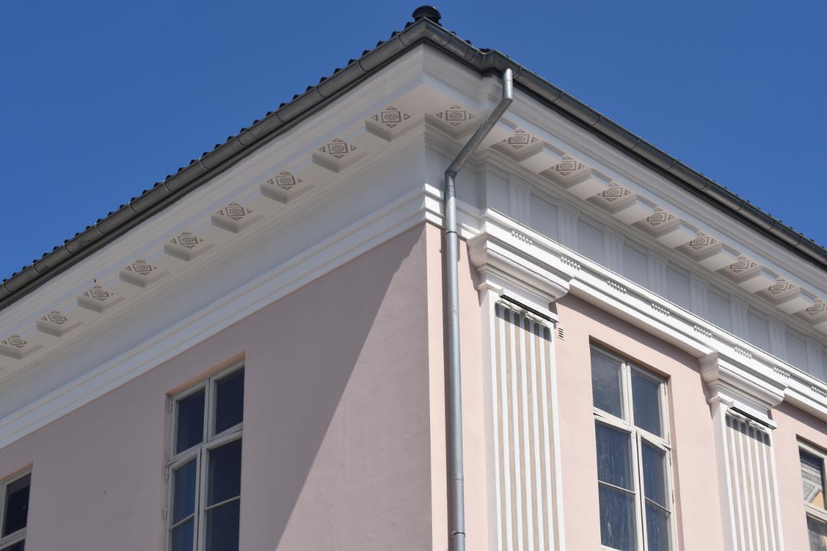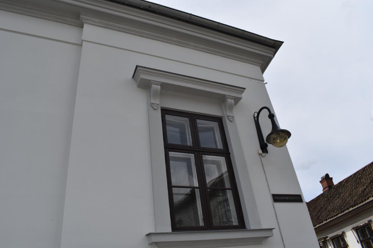 Beskrivelse: Full antikvarisk fasaderehabilitering. Malingsfjerning, utskifting av skadet tegl, ståldragere over vinduer og dører, kalkpuss, silikatmaling og gipsmakerarbeider.